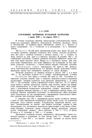 Пийп Б.И. (1946) Состояние активных вулканов Камчатки с июня 1941 г. по апрель 1943 г. // Бюллетень вулканологических станций. № 13. С. 3-5.