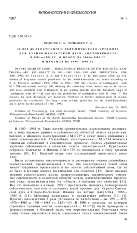 Федотов С.А., Чернышев С.Д. (1987) 20 лет долгосрочного сейсмического прогноза для Курило-Камчатской дуги: достоверность в 1981-1985 гг., в целом за 1965-1985 гг. и прогноз на 1986-1990 гг. // Вулканология и сейсмология. № 6. С. 93-109.