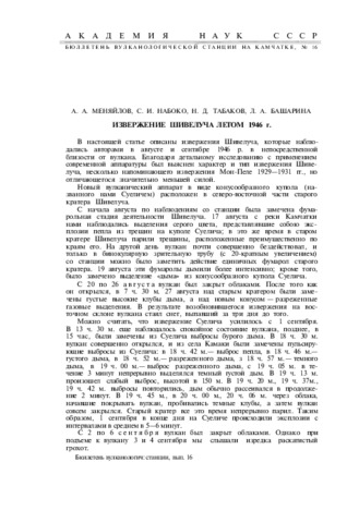 Меняйлов А.А., Набоко С.И., Табаков Н.Д., Башарина Л.А. (1949) Извержение Шивелуча летом 1946 г. // Бюллетень вулканологической станции на Камчатке. Вып. 16. С. 3-11.
